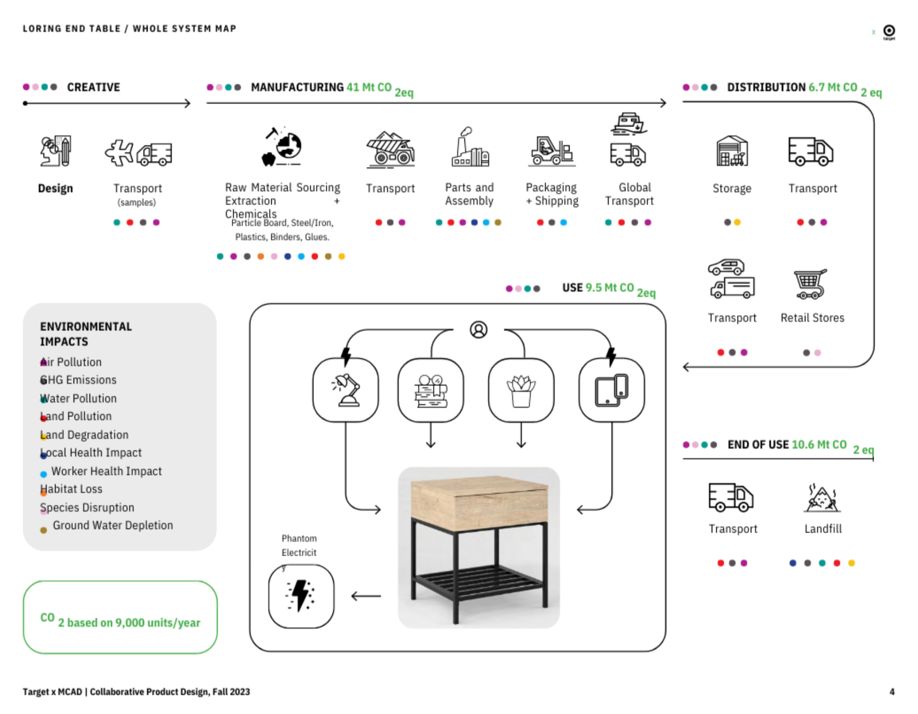 This research project created a design brief for the eco-redesign of Target Corp.'s Loring End Table, integrating behavior design, innovative material exploration, and life cycle assessments to reduce CO₂ emissions, double the product lifecycle, minimize phantom energy, and promote circularity without compromising quality or cost.